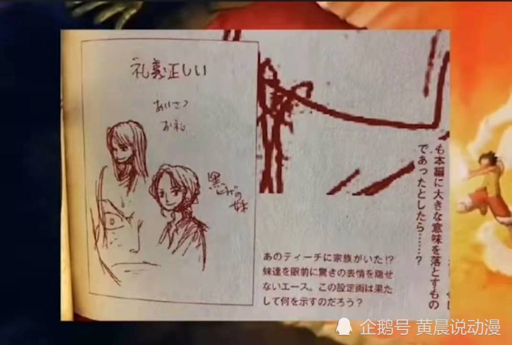 第二种猜测,黑胡子身体是有三个灵魂,或者是有三重人格,说是有两个姐妹,大家看一下,这张图是流传出来的手稿,这是一张海贼王极恶世代的人物设计手稿,图上有两个女孩子,还有艾斯惊讶的脸,旁边配上的文字是有礼貌·打招呼·道谢,黑胡子的妹妹,另外手稿和下方又备注上了一行字,那个蒂奇有家人,这是说明什么呢?还有这张图,艾斯说黑胡子人生是常人的好几倍。