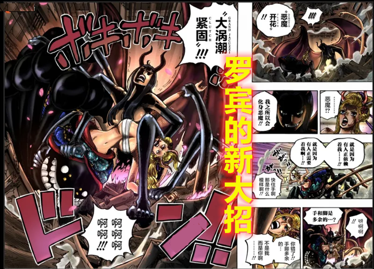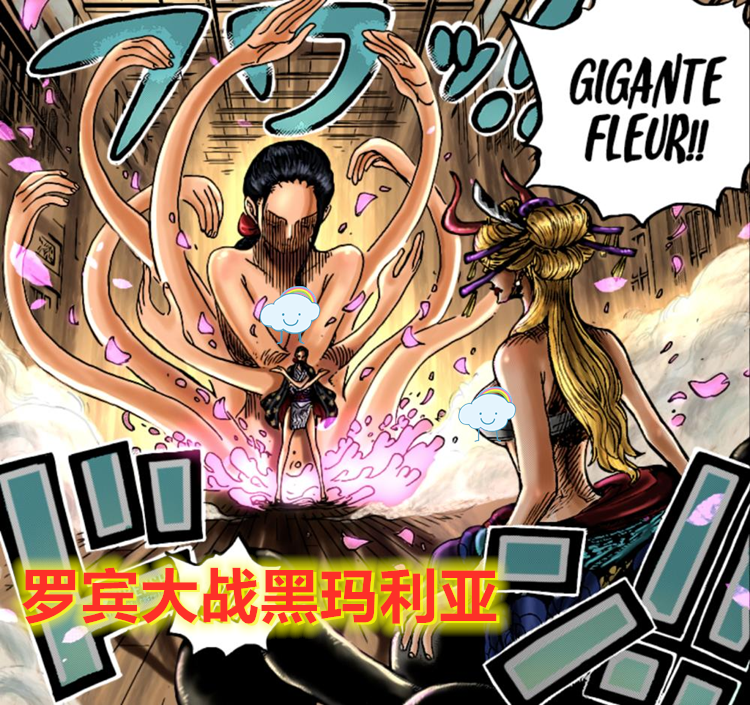 虽然设定上近乎无敌,不过,花花果实有一个最大的弱点,那就是新长出来的这些部位所受到的伤害,最终会转移到本体中来。黑玛利亚在识破这一点后,她就疯狂攻击那些巨大化的手和脚,从而重创了罗宾。罗宾无奈之下,只能撤回了这些招式。黑玛利亚则乘胜追击,险些活捉了罗宾,不但如此,她还口出狂言,像那些讨厌的“山黑”一样,大肆吐槽和讽刺山治。黑玛利亚的这个操作,彻底激怒了罗宾。