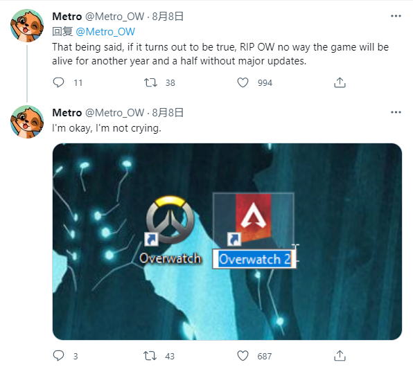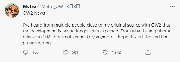 IT之家8 月 9 日消息 知名“守望”爆料人 Metro 在近日发推特表示,通过他从《守望先锋 2》开发团队那里打探到的消息,《守望先锋 2》的开发时间比预期的还要长,该游戏在 2022 年发售几乎是不可能的。