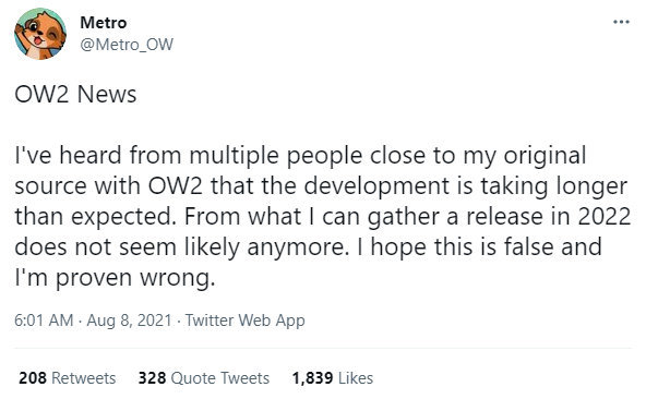近日,《守望先锋》知名爆料人“Metro_OW”发推称《守望先锋2》的开发时间比预期要长,很难在2022年发售。Metro_OW曾正确预测了《守望先锋》的第29位新英雄艾什,他表示本次的消息来源于《守望先锋2》的开发团队。