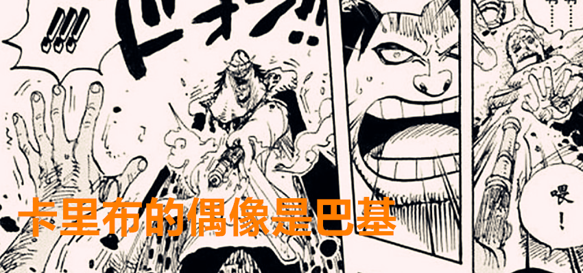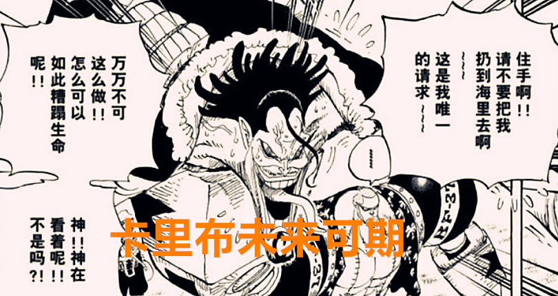 在他心目中的大人究竟是谁?我感觉就是巴基大神。卡里布这种逗比适合上巴基的船,巴基喜欢大型的聚会,食物和物资都需要比较大的空间储存。卡里布就刚好填充了这个漏洞,更重要的是,卡里布应该是看过顶上战争的直播,那时候的巴基可以说是神仙级别的海贼,敢于怒怼红发, 跟白胡子聊起了战术,俘获了一群小米弟,所以说卡里布被巴基的高光镜头所吸引了,卡里布变成巴基的船员,未尝不是一种出路。