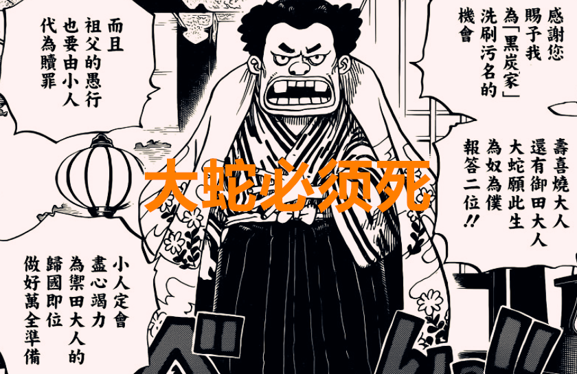 不过我认为尾田对大蛇的塑造是很失败的,完全是一个堪比斯潘达姆水平的跳梁小丑,果实能力用得烂,实力低下,没有任何领袖魅力,说白了,这家伙就是一个傀儡,任由其他人来摆控。所以御田的武士们也说过,要不是有凯多罩着,他早就死了。