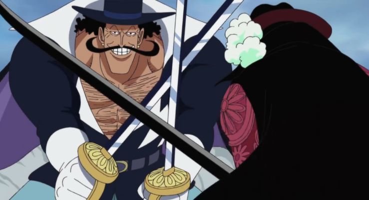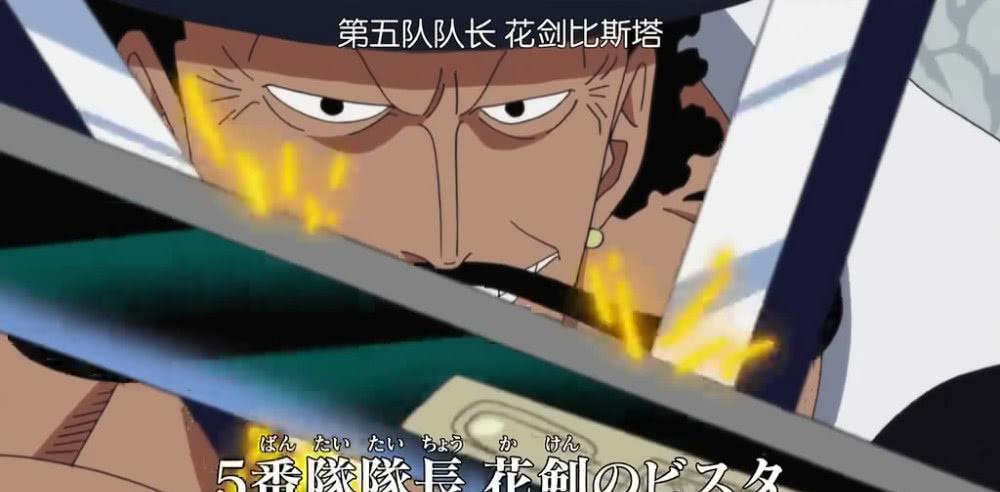 花剑比斯塔是白胡子海贼团第5番队队长,鹰眼第一次看见他,就说出了他的名字。鹰眼可是“世界第一剑豪”,能让他记住名字的人不多。花剑比斯塔曾经和鹰眼展开过战斗,花剑在战斗中完全不落下风。二人剑术相当,难分胜负。鹰眼主动提出休战,并且很期待和他的下一次对决。