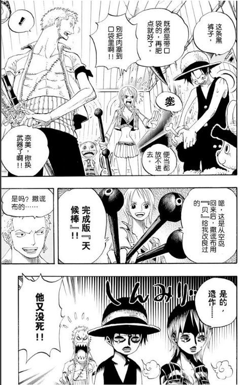 后来有足够的时间和素材以后,乌索普从空岛拿到货,又着着实实帮娜美改良加强了一下,终于造出了完成版天候棒。