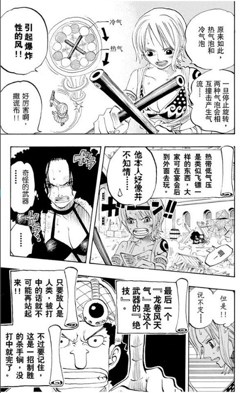 以及这里虽然乌索普并没有意识到自己发明了引起爆炸性的风,热带低气压,但是也侧面暗示了乌索普的杂知识储备量之丰富——冷热气流能够带来像飞镖的效果除了气候专家天才航海士娜美,博学多才罗宾,可能加上海之子山治以外,估计也就乌索普了。而且直觉上敏锐察觉娜美的武器应该是能灵活利用冷气泡,热气泡,电气泡的武器,说乌索普是天才发明家也不为过吧(千万别说冷气泡热气泡电气泡也只是乌索普用来炒热宴会的,说明书上明确说了这是战斗功能,只是开发时间太短,还没有研究完毕,可以暂时用来炒热宴会)