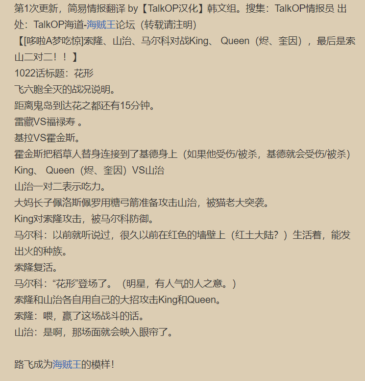 海贼王1022话情报流出,“飞六胞”悉数落败,惨淡退场,本话主要集中在“三灾”的战场,而本话的高光时刻正是山治与索隆的联手作战。