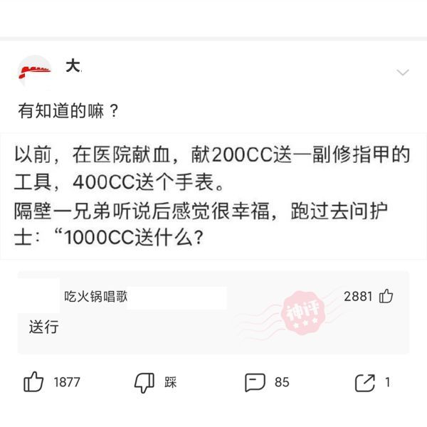 【沙雕问题14】:有知道的吗?献血1000CC送什么?