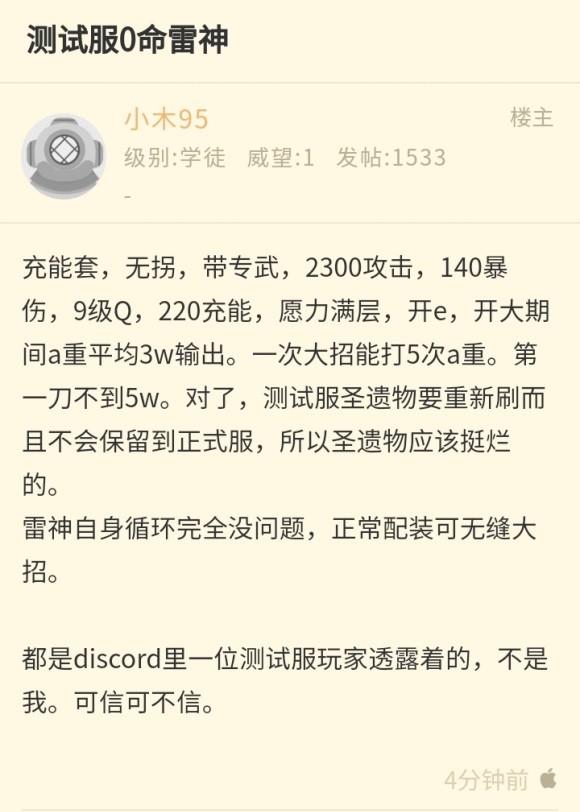 戒戒觉得从目前的爆料资料来看,雷电将军在9月份实装的概率还是蛮大的,那么她的强度会如何呢?之前也有玩家爆料过测试服内的情况:“充能套,无拐,带专武,2300攻击,140暴伤,9级Q, 220充能,愿力满层,开e开大期间a重平均3w输出。一次大招能打5次a重。第一刀不到5w。测试服圣遗物要重新刷而且不会保留到正式服,所以圣遗物应该挺烂的。雷神自身循环完全没问题,正常配装可无缝大招。”戒戒觉得这种数据大家看看就好了,不需要当真。