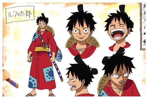 为了配合和之国的穿着风格与文化背景,动画组可谓是用心良苦。在设计上,路飞的发型更换为日式经典的束发发髻,而这种发型最直接的结果,便是导致路飞无法佩戴草帽,因此他只能将草帽背在身后。至于路飞身着和服的配色,动画组则依旧延续路飞惯常穿着的大红色为主色调,周身辅以蓝色调方形补丁作为点缀。