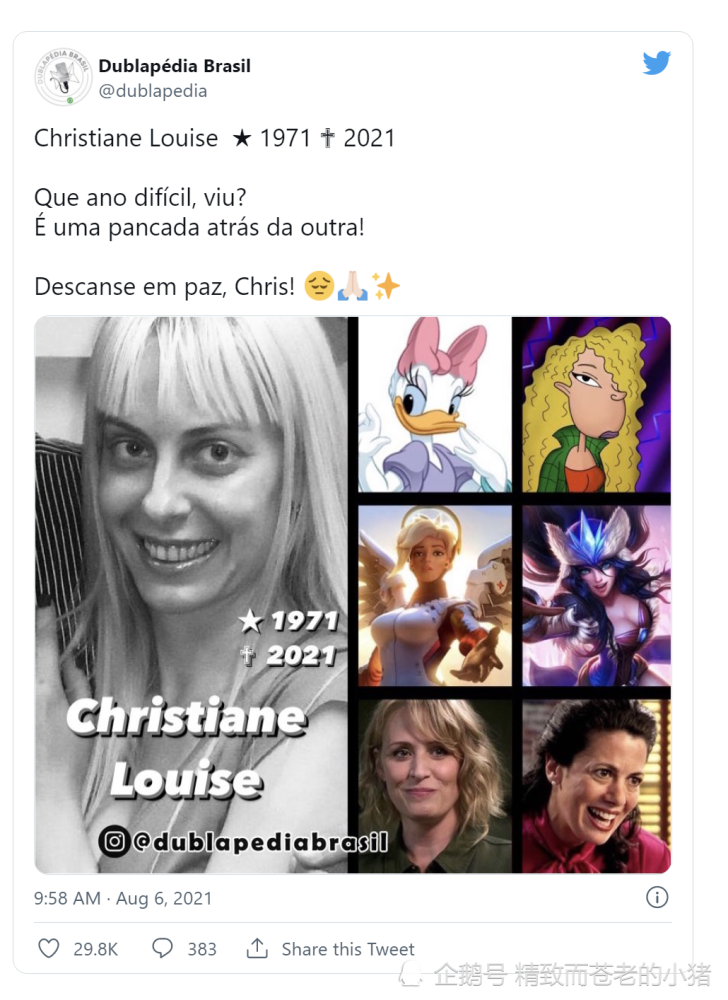 Christiane 不幸的消息在 8 月 6 日由同样是配音员的 Mário Tupinambá Filho 于 Instagram 发布,享年 49 岁。 Christiane 自 1994 年以来一直从事配音工作,除了许多电视剧屏幕的角色外,她也是《守望先锋》天使、《最后一战》科塔娜与《英雄联盟》希维尔、《魔兵惊天录》(Bayonetta)等知名角色的巴西配音员。