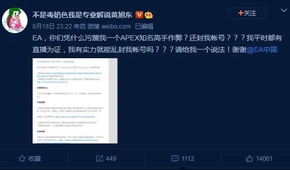 近日国内电竞圈知名解说黄旭东发微博怒怼EA,称自己的《Apex英雄》游戏账号因涉嫌作弊被封禁。他有实力就能乱封他帐号吗?黄旭东要求官方给他一个说法。