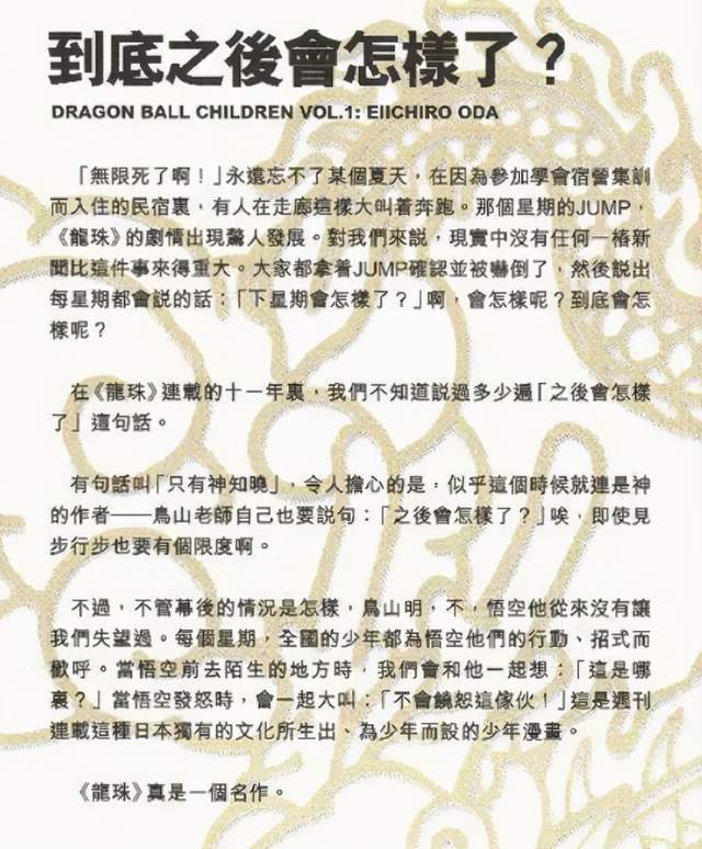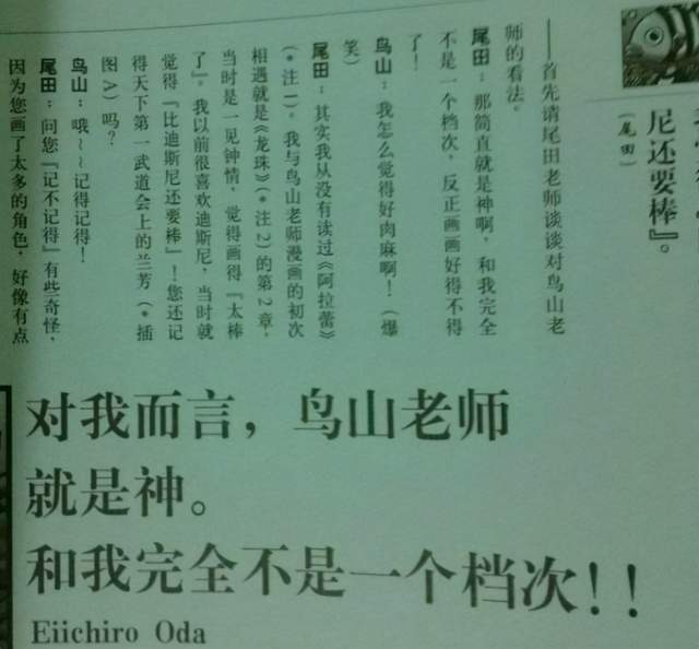 而在多次访谈里头,尾田甚至动用了“中二”的力量将鸟山明捧上天,直呼他就是神,和自己完全不是一个次元的---