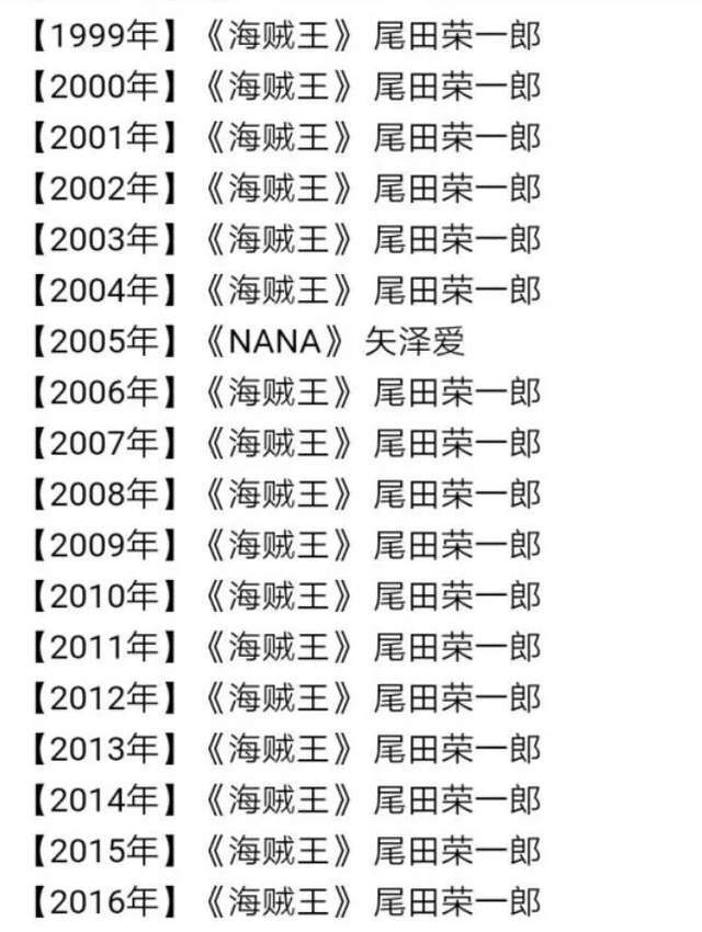 而《海贼王》漫画销量从1999年开始就几乎屠榜,除了05年被《NANA》超越,以及最近两年《鬼灭之刃》的现象级爆火之外,它便是长篇日漫里的绝对王者---