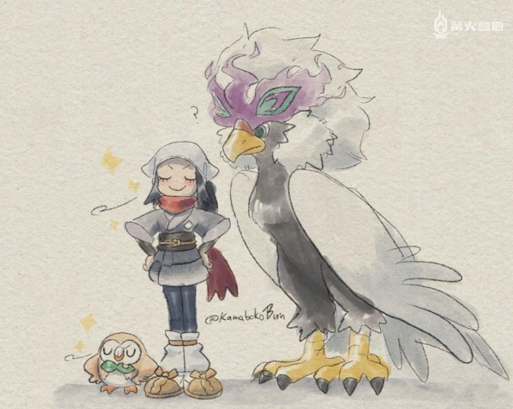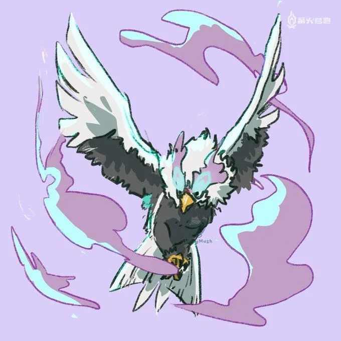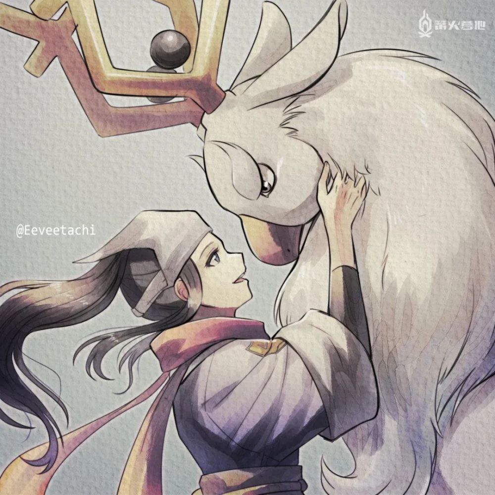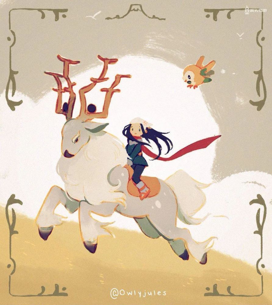 另外,在昨晚的发布会中,诡角鹿和勇士雄鹰(洗翠的样子)的出场也深受不少玩家的喜爱。根据设定,诡角鹿是洗翠地区近角鹿的进化形态,一直以来都深受人们的重视,它脱落下来的体毛采集起来可以制成上等的防寒服。勇士雄鹰(洗翠的样子)则是毛头小鹰进化后的形态,它一到冬季就会从北方飞来,不太喜欢单独行动,以下是玩家们在看了昨晚的直播后为他们创作的画作: