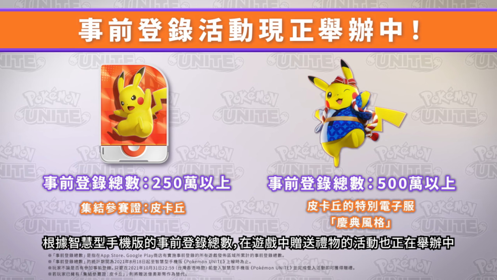 <script>window.DATA.videoArr.push({"title":"「象牙猪」与「仙子伊布」技能展示","vid":"t3269amktoy","img":"http://puui.qpic.cn/vpic/0/t3269amktoy.png/0","desc":"「象牙猪」与「仙子伊布」技能展示"})</script>而在《宝可梦大集结》本次发表最重要的就是即将于 9 月 22 日推出的 iOS / Android 双版本,可与 Nintendo Switch 版连线,目前已经开放事前登录,总数超过 250 万将赠送皮卡丘集结证(也就是英雄使用权),超过 500 万将赠送皮卡丘的造型「庆典风格」。