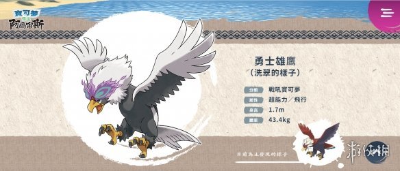 在冬季自北方飞来,孤高的鸟宝可梦:洗翠地区的毛头小鹰进化后,就会成为勇士雄鹰(洗翠的样子)。冬季来临时,牠会从北方飞来。体型比目前为止发现的勇士雄鹰还要大,喜爱独来独往,几乎不会集结成群。