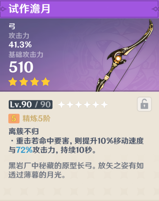 但这就带来了一个问题,那就是甘雨的武器,需要打弱点叠buff的试做澹月要退环境了。这把武器额外的41.3%攻击力确实不错,但基础攻击力只有510,这个确实低了点。当然,如果是站场甘雨,那么精五之后重击命中要害,还可以增加72%的攻击力,那输出是很可观的。