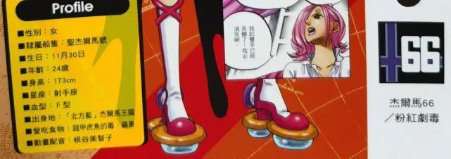 她性别女,所属船只是圣杰尔马号,生日为11月30日,年龄居然24岁,爱了。身高173CM,你能驾驭吗?出生地为北海杰尔马王国,最爱吃【铠甲虎鱼的毒、蔬果】,动画声优是【根谷美智子】,属于杰尔马66的粉红剧毒、剧毒粉。