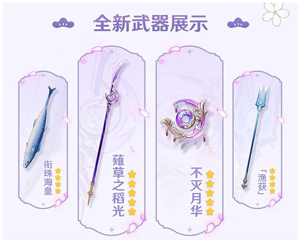 五星:雷电将军专武:薙草之稻光;珊瑚宫心海专武:不灭月华;