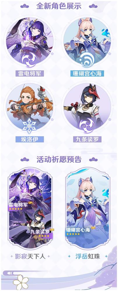 活动祈愿:【雷电将军】将与【九条裟罗】先一步上线祈愿池,随后便是【珊瑚宫心海】。