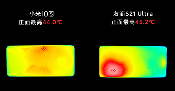 通过比对,小米10S平均帧率为53.8fps,机身正面温度44度,而三星S21 Ultra平均帧率为47.3fps,机身正面温度45.2度。