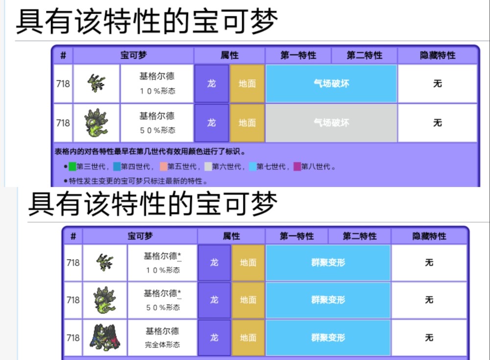 第八世代修改了“群聚变形”的设定,基格尔德在对战外不会自动转变形态,使用基格尔德多面体才能让它从50%形态和10%形态之间变换以及改变特性。