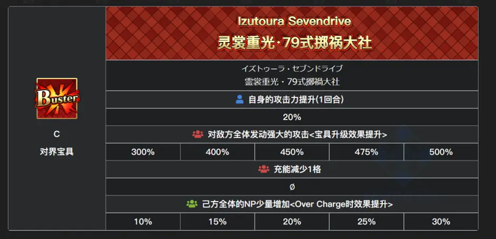 宝具前置20加攻1T,全体灭气+后置己方全体NP,1oc10,5oc30。被动还有自身20军略。自buff 1.5A*1.2B*1.2C(不特攻)。如果用w杀狐-4CD,T3她自己还能再开一层特攻和红放。