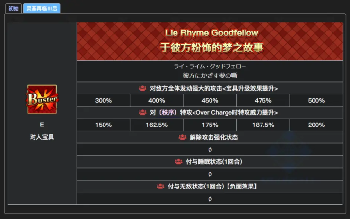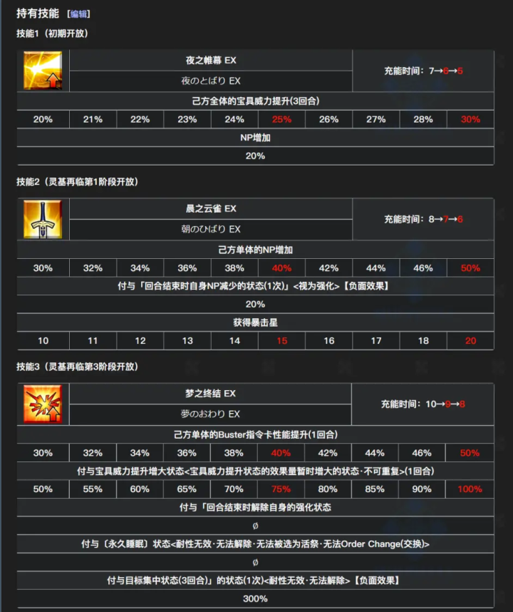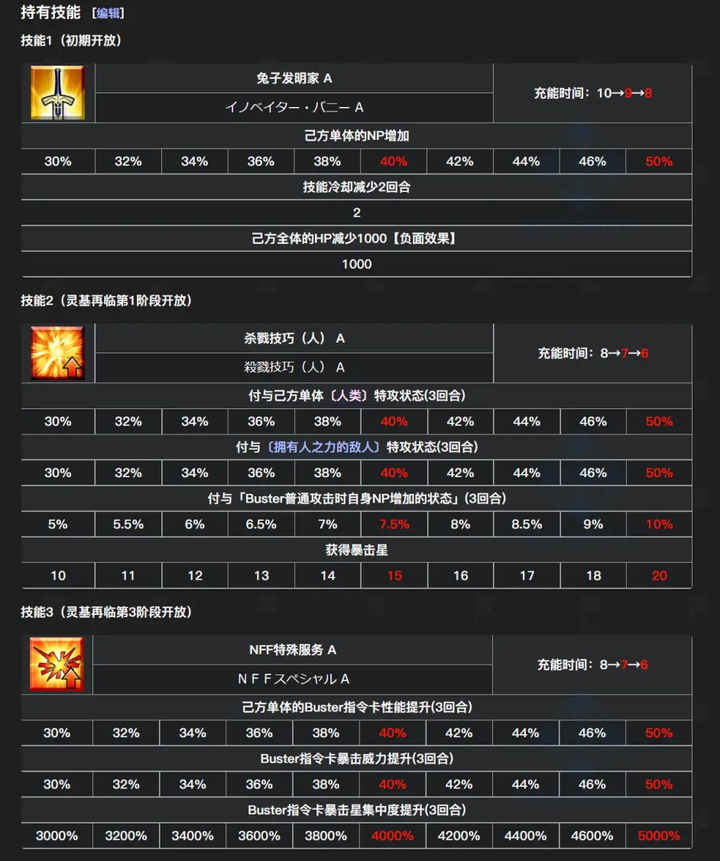 二技能赋予我方单体人类特攻状态(并非人型,人类不包括从者)与人阵营,特攻状态各3T50,与红卡平A时自身NP增加10NP的状态,出星20;