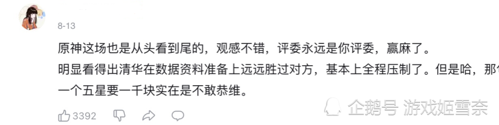 除此之外,评委1还对辩手未能提及《原神》在国际上的影响力而感到遗憾。作为一款曾在27国登顶,登录PS5、switch等多家重量级平台的游戏,《原神》的确完成了冲出亚洲走向全球的壮举。并以多种方式向国外友人展现出了我国的文化之深、自然之美、抗疫之强,引来无数老外的万千感慨,而这则是其他游戏所无法企及的。