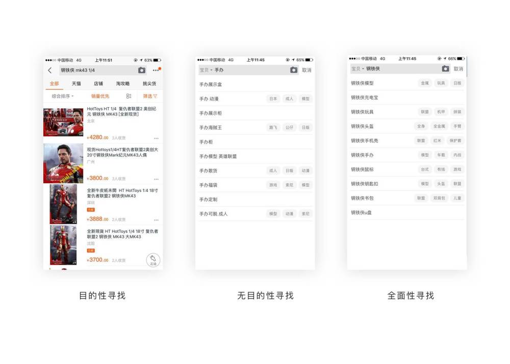 1.目的性寻找(搜索)。举个例子,新房装修想买一组钢铁侠手办做装饰,那么我就打开淘宝输入钢铁侠手办1/4或者1/6,选择评价好的,价格低的店家就进行购买了,我知道在哪里能找到这样的手办,以及手办的类型,做工以及价格,所以我是带着明确的目标去寻找的。