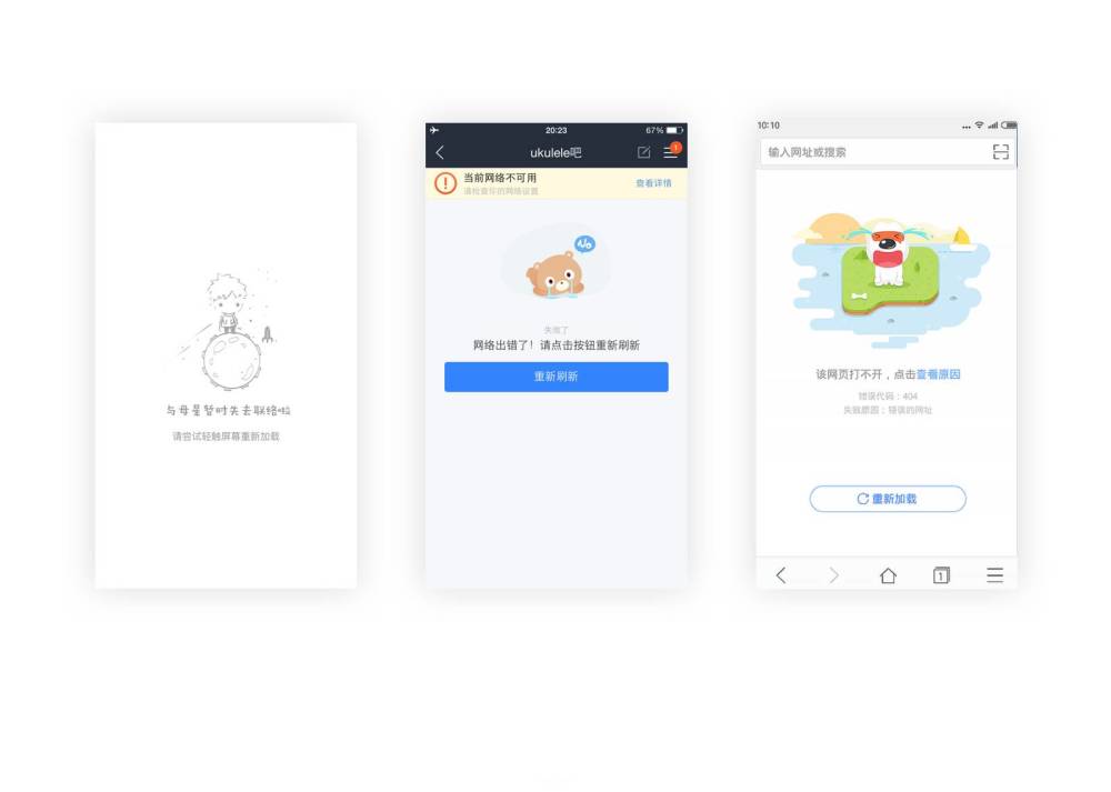 出错页面其实是可以被原谅的,但是请注意,不要进一步让用户迷惑,焦虑。需要做的是说明错误原因,并告诉用户接下来如何解决或者其他选择。出错页面其实是可以被原谅的,但是请注意,不要进一步让用户迷惑,焦虑。需要做的是说明错误原因,并告诉用户接下来如何解决或者其他选择。一般的用户遇到无法读取数据的时候第一个操作总是刷新网络,他们甚至会切换网络或者关闭重开网络来试图重新获取数据,但是在开发人员眼中并不是所有状态都是网络造成的问题,只是用户觉得所有问题都是来自于网络。还有一种是在网络差读取数据慢的时候可以做一个预加载,提前告知用户将要出现的内容,这样也能缓解用户等待时的焦虑。