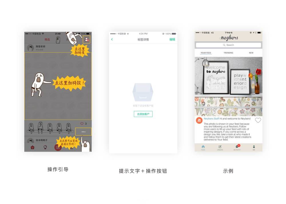 和web端一样,移动端的空白页面越来越受到重视,不单单是视觉层面,空白页承载着更多内容,起到更多功效。同时,我们也将无数据页面分成三种情况: