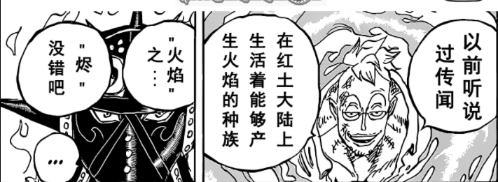 在乔巴带着索隆跑路的过程中,烬对索隆发起了攻击,马尔科现身挡下了烬的火球,这里提到了烬的身世,之前大妈上岛时就因为烬的种族特殊,想拉他入伙,从马尔科的话来看,烬是红土大陆上生活,并且能产生火焰的种族,并且着重提到了火炎的烬,看来红土大陆还有不少坑要填。