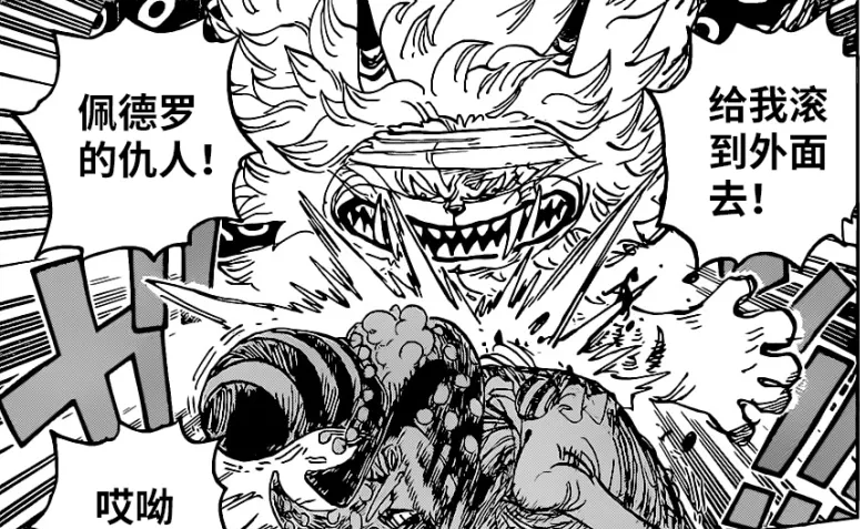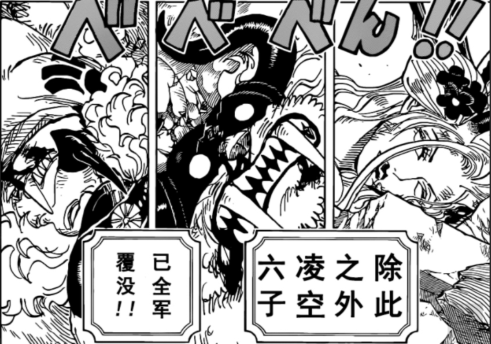 这一话的开头是鬼之岛的战况,目前凌空六子战已经全部结束,除了卧底德雷克之外,其余五人都已经被草帽海贼团和大妈联手解决,地图上给出了五人落败的位置,只有黑色玛利亚、福兹福、佐佐木三人出现昏迷的样子,佩吉万和乌尔缇则是没有出现,这里估计是对应了凌空六子落败的情况,黑色玛利亚等人是被罗宾、甚平、弗兰奇单挑打败,佩吉万和缇娜更多是因为大妈插手(大妈还是主力输出)。
