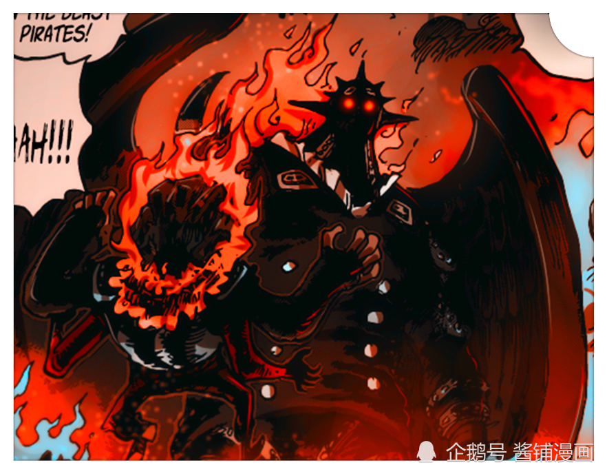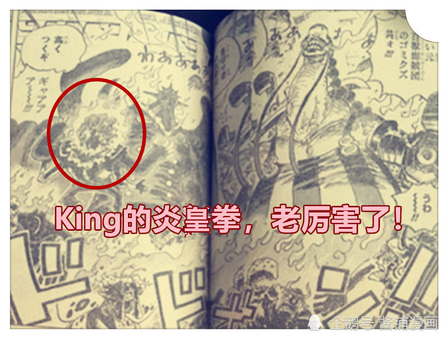 在战斗中,King使用了自己特殊的技能,那就是【炎皇拳法】,手中持续冒着火焰,犹如自然系烧烧恶魔果实的技能“火拳”与“火达摩”一样。一直燃烧着。