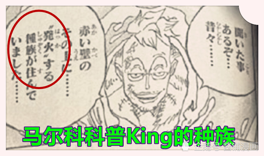第一,马尔科是如何了解King的种族的,作者尾田大神曾经介绍马尔科的时候,提到马尔科爱好读书,拥有医学知识,还会阅读航海文献,是一个相当可靠的航海员与船医,用酱铺君通俗的话讲,就是马尔科饱读诗书,爱好科学知识,是个全才,又跟随四皇白胡子游历四方,所以King的情况就不足为奇了,马尔科可能看过类似的书籍,或者在航海到某处后,通过冒险经历了解到的传闻。