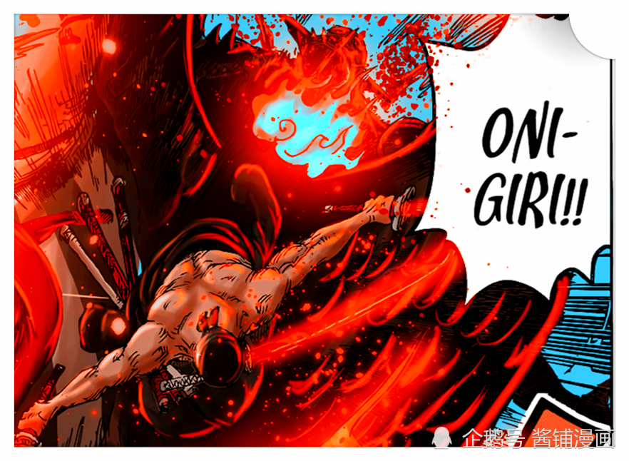 King与奎因发觉苗头不对,却来不及了。索隆的绷带爆开,然后喊着三刀流的【炼狱鬼斩】,山治则使出恶魔踢技【羊肉SHOT】,才有了非常令人兴奋的,二人同时攻击奎因与King的经典画面。
