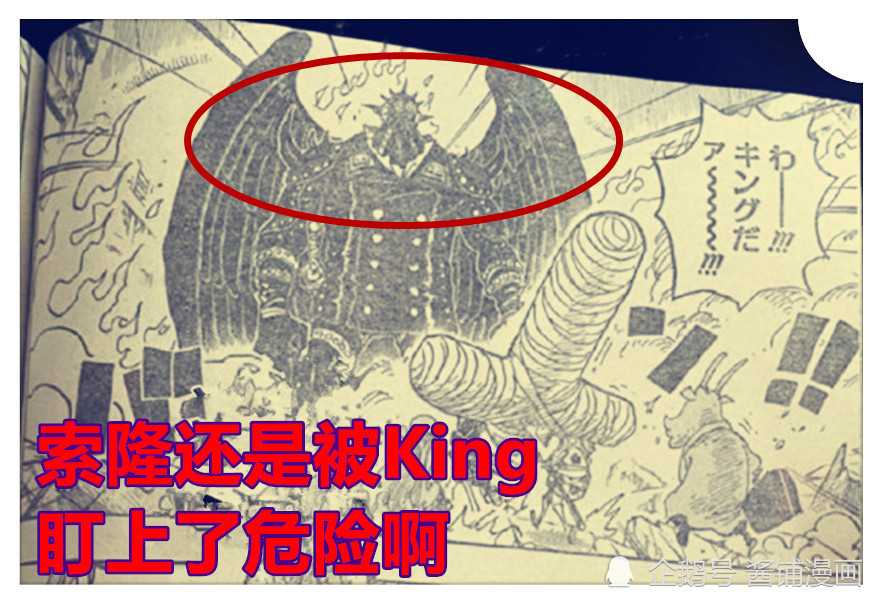 彼时,绷带索隆是由两个武士帮忙抬着,一行人见到高大的King站在面前,吓得腿都软了,乔巴更是因为蓝波球的副作用,还是婴儿宝宝的状态,无法反击,他已经吓得哭出来了。