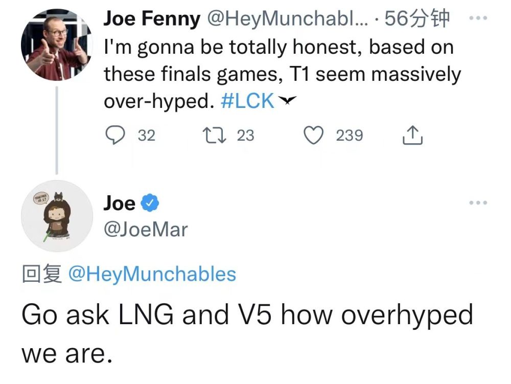 就在T1以势不可挡之姿夺得春季赛冠军以后,看完比赛的LPL英文流解说发推表示:“说句实在话,单纯看决赛的这几局,T1看起来有些被过于高估了。”不料T1的老板马上在底下回复:“你去问LNG和V5,我们到底有没有被高估?”