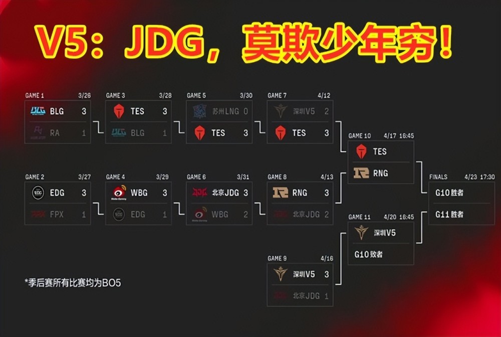 而4月16日的比赛,则是由V5对阵JDG,看这两支败者组的队伍,到底是V5能大威天龙临凡,还是JDG继续自己的黑八奇迹!