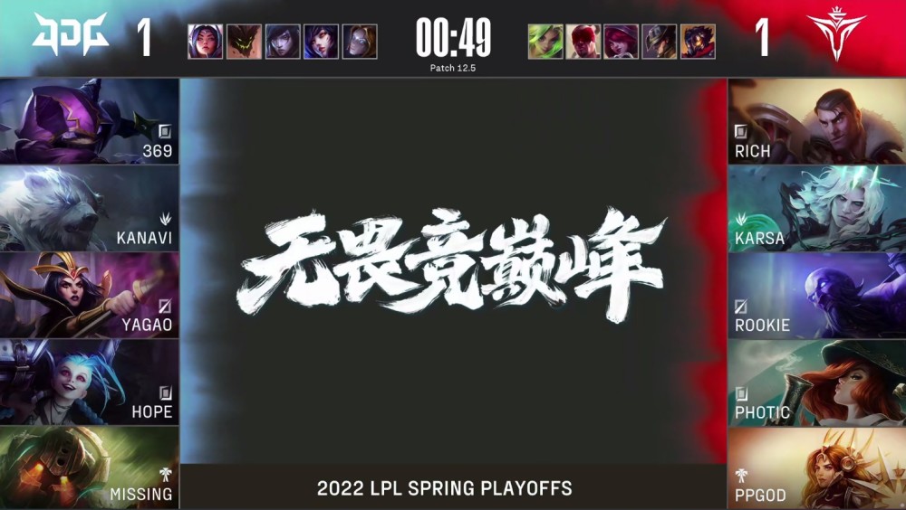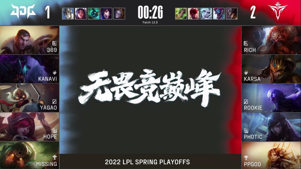 第二局比赛,V5蓝色方,禁用瑞兹、破败之王、挖掘机、洛、石头人,选用Rich杰斯、Karsa盲僧、Rookie卡牌、Photic厄斐琉斯、Ppgod曙光女神;JDG红色方,禁用泽丽、狐狸、发条、妖姬、辛德拉,选用369塞恩、Kanavi狗熊、Yagao维克托、Hope霞、Missing泰坦