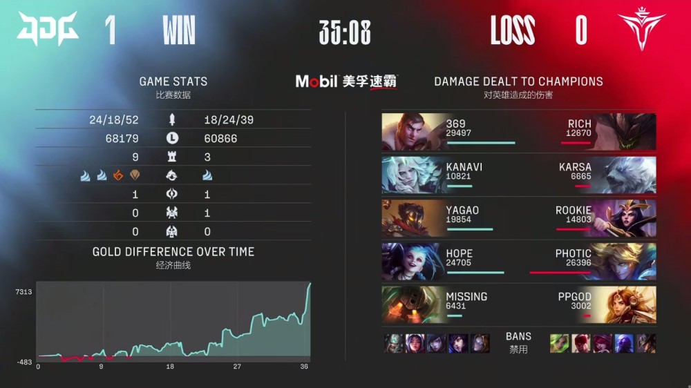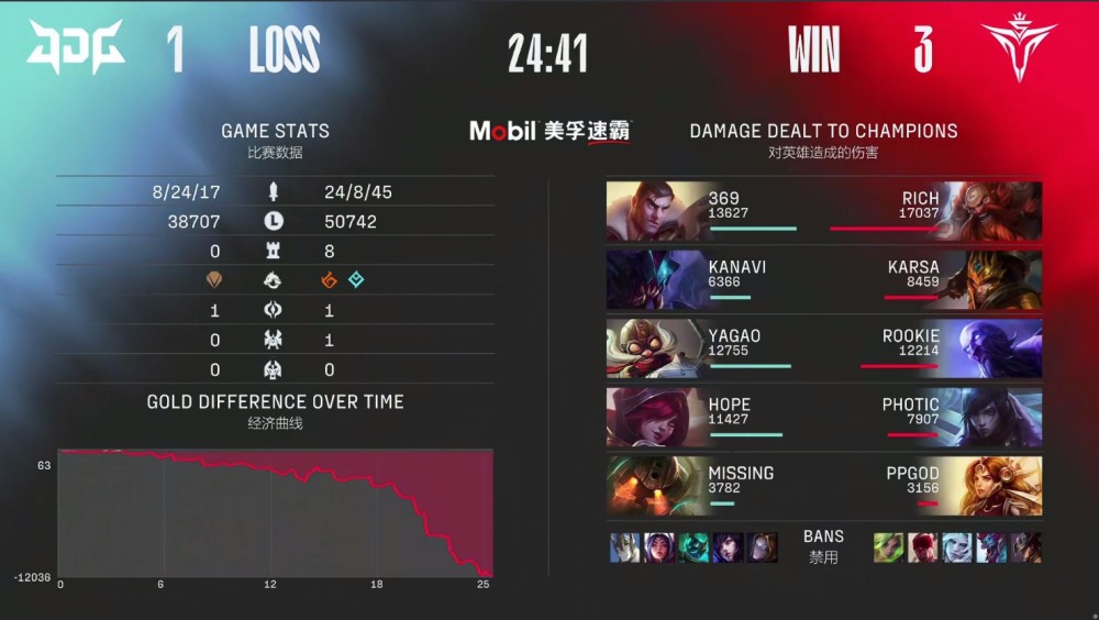 第四局比赛,成为了V5单方面的大乱斗,军训局。特别是369,在面对青年的Rich的时候,接连被军训,杰斯被酒桶打得没有了脾气。结果第四局比赛,V5在25分钟内,打出了24-8-45的KDA,轻松赢下比赛,挺进败者组下一轮。