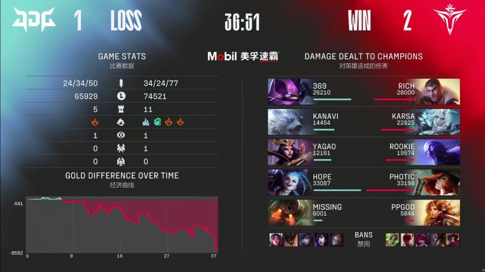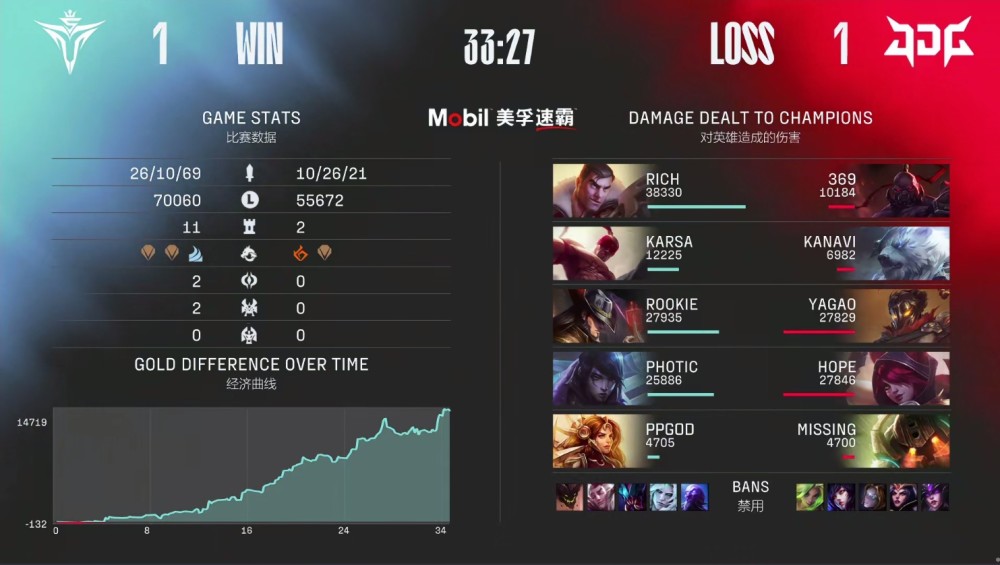 第一局比赛,JDG蓝色方,禁用发条、狐狸、厄斐琉斯、刀妹、蛮王,选用369杰斯、Kanavi破败之王、Yagao维克托、Hope金克斯、Missing泰坦;V5红色方,禁用泽丽、盲僧、霞、瑞兹、卡牌,选用Rich石头人、Karsa狗熊、Rookie妖姬、Photic伊泽瑞尔、Ppgod曙光女神