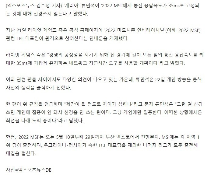 昨日晚,拳头官宣LPL赛区的参赛队伍在中国远程参加2022季中冠军赛,并且比赛期间所有队伍的延迟尽量控制在35ms左右。T1战队Keria选手在直播中也谈到这个话题,并阐述了自己的想法: