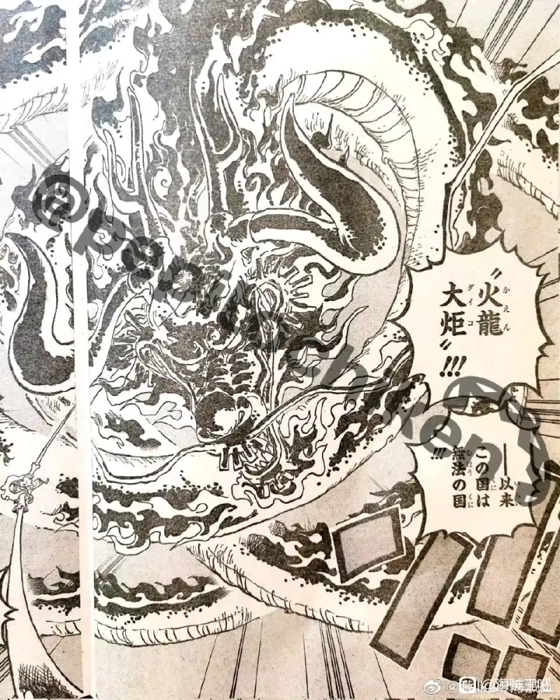 故事进入正篇,路飞的大拳头还在蓄力着,等待着让桃之助把鬼岛移开之后,给予凯多奋力一击。凯多迎难而上,嘴里吐出了热息。