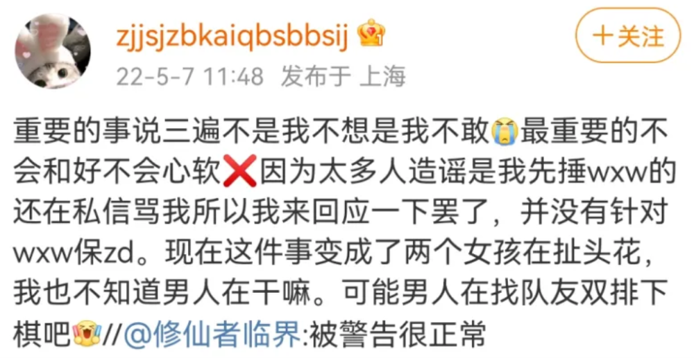 再往后Knight风波逐渐平息,正如贝贝所言,这一切反倒成了“两位女生的独角戏”,就在5月7日,Knight前女友贝贝说出不再爆料的隐情:因为马赛克截图的事情,我被警告了,我是一个普通人,无法以一己之力抗衡俱乐部内部、粉丝,感谢大家的支持,负面的评价不会再看。
