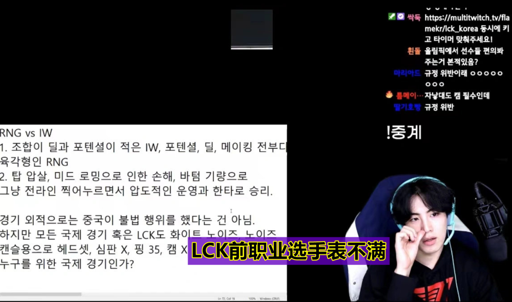 比赛结束,LCK的前职业选手就针对RNG与IW的这场BO1,说出了自己几点不满意的地方,首先RNG虽然线上参赛,但却没有摄像头、没有戴耳机,并且就连裁判都没有,同时还享受了35ping的优势待遇,所以让他怀疑MSI到底是为各大赛区举办的,还是专门为了LPL才举办的。