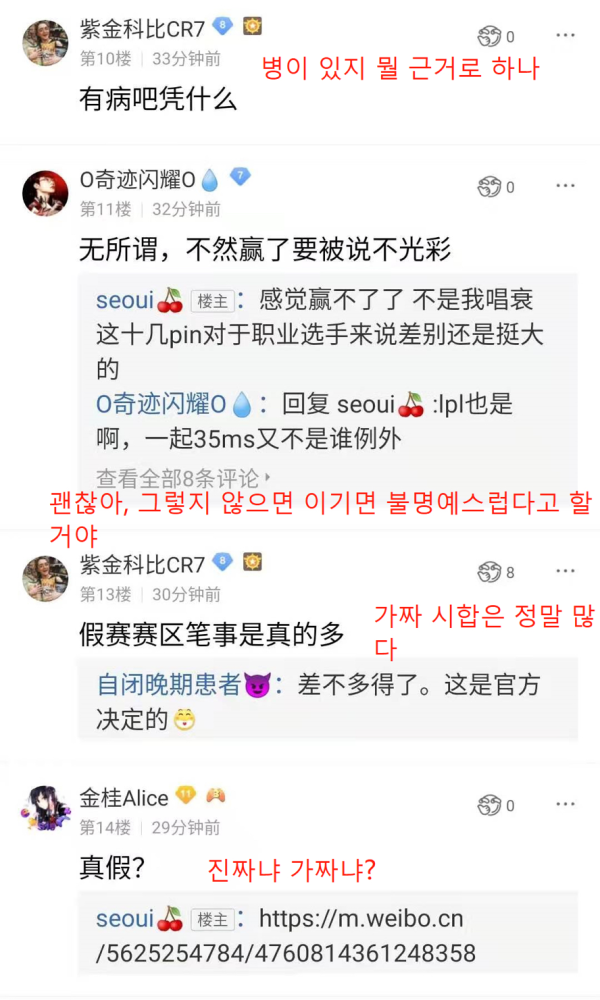 还有一些LPL观众就这件事给LPL赛区安上一个假赛赛区的名字,说假赛赛区的事真多,人家都能克服的事情到LPL就克服不了,Bo假赛这件事确实是个耻辱,但谁能肯定LCK或者其他赛区就没有,有时候没查出来不代表没有,明明都是汉字但看起来像个韩国论坛,不得不说这届韩国网友中文真好,不仅可以无压力对话还偶尔用几个成语,甚至还有一些更过分的直接开喷起来。