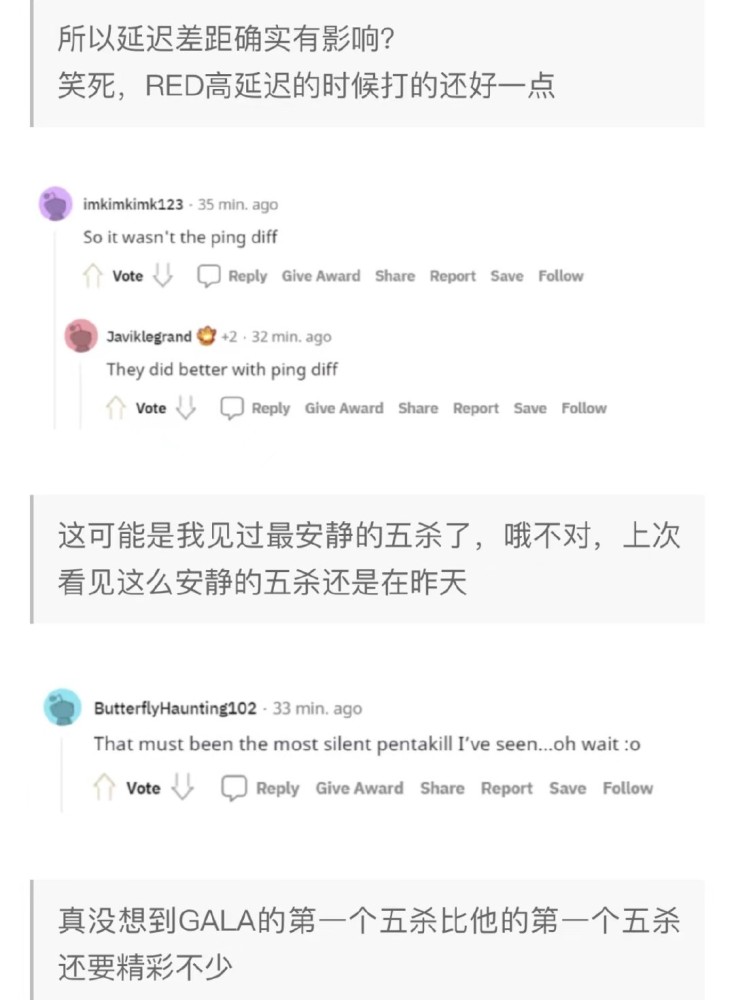 gala的五杀也是引起了reddit的网友热议,网友表示:真没想到GALA的第一个五杀比他的第一个五杀还要精彩不少;这可能是我见过最安静的五杀了,哦不对,上次看见这么安静的五杀还是在昨天;所以延迟差距确实有影响?笑死,RED高延迟的时候打得还好一点。从结果来看,RNG并不是因为延迟重赛的最大受害者,RED才是,毕竟虐一次还不够,还要来第二次,而且这次比上次还要惨,真是让人心疼。