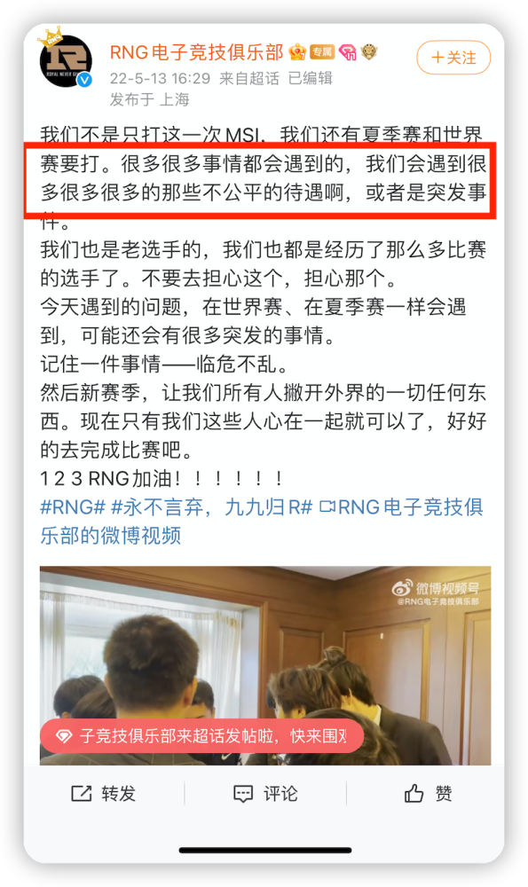 RNG 官方也发了一条微博,直接指出「不公平待遇」几个字,瞬间点爆了网友的情绪。
